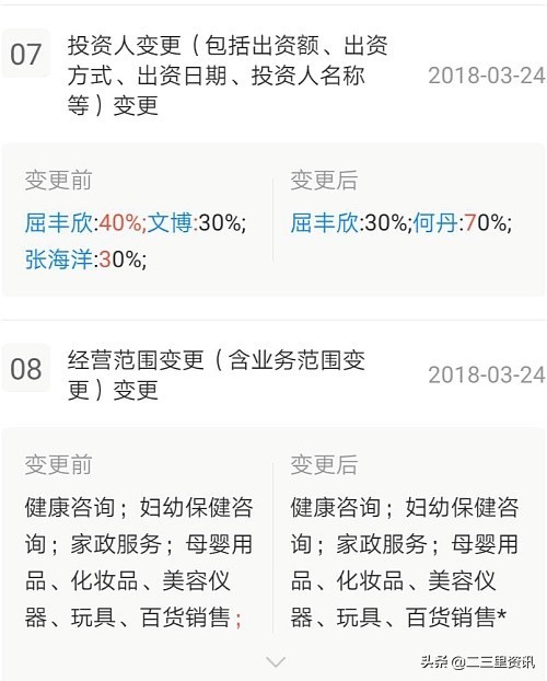 此前屈某欣还与何某一起曾在2017年1月和何某注册了一家南阳市宛和健康管理咨询有限公司,经营范围为“健康咨询;妇幼保健咨询;家政服务;母婴用品、化妆品、美容仪器、玩具、百货销售”。而在南阳市还有一家以“宛和”命名的美容公司,全称为南阳市市辖区建设路宛和美容中心,经营者为何某。