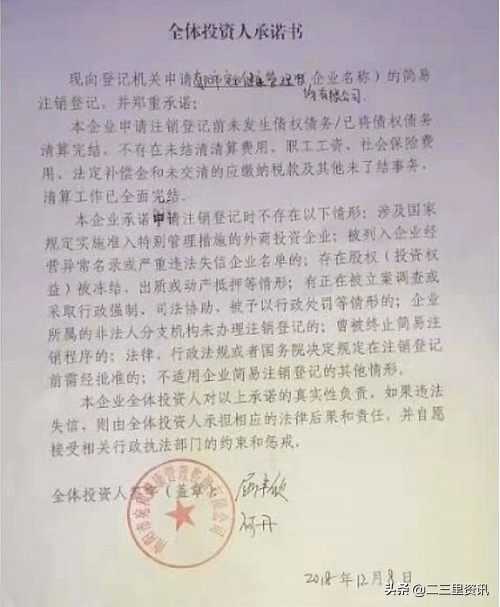 信息中还有一个全体投资人承诺书端口,点开即可看到知情人所述的承诺书。然而,在这些信息中心并未显示其注销原因。