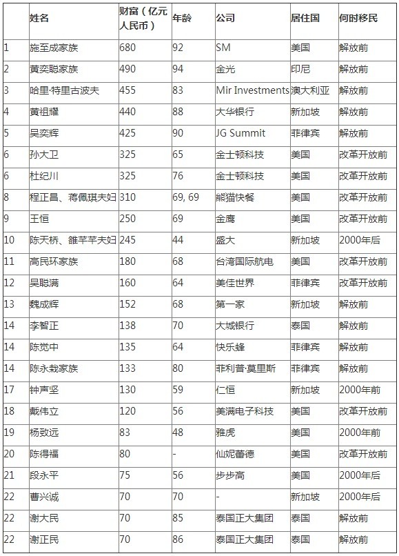 从解放前到现在,在大中华地区有很多富豪移民国外。有些是在年幼时就移民,之后在异国他乡打拼出了一番事业,有些则是在国内赚到足够的钱后再选择移民。