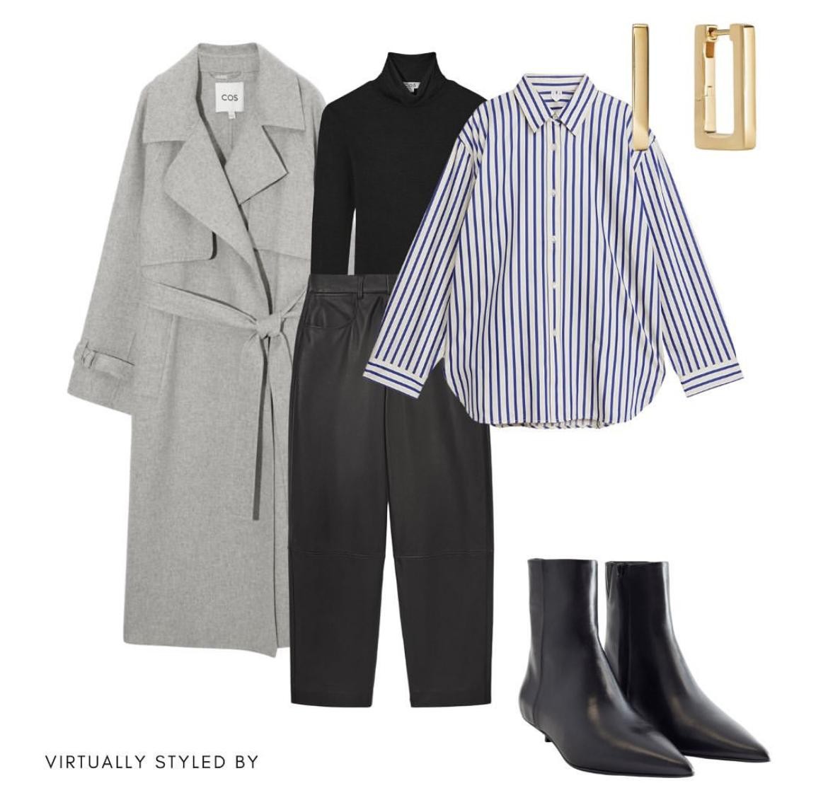 大衣是还带着寒意的春天必须有的衣服,但这种薄款大衣就没法再搭西装了。我们可以用衬衫作为内搭外套,用显瘦的一身黑衣打底,条纹衬衫配黑色高领毛衣尤其很显质感,轻松完成一身洋气搭配。