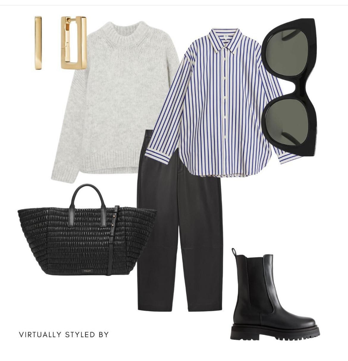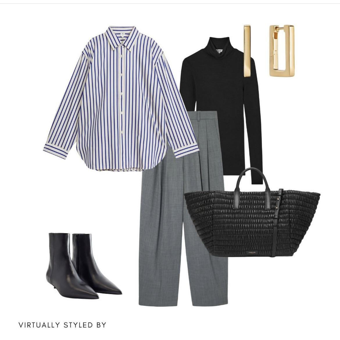 我自己喜欢的,是偏成熟风一些的搭配,用高领黑毛衣和深灰色西裤搭配,更修身的毛衣能穿出显瘦感觉,简单把条纹衬衫一穿,不用系纽扣任由衣襟自在飞起,穿得成熟也潇洒。