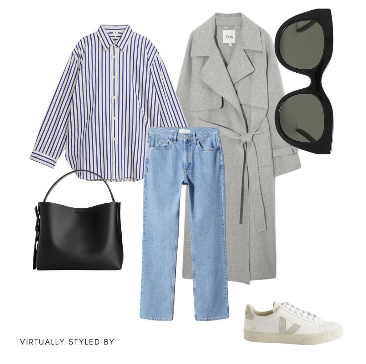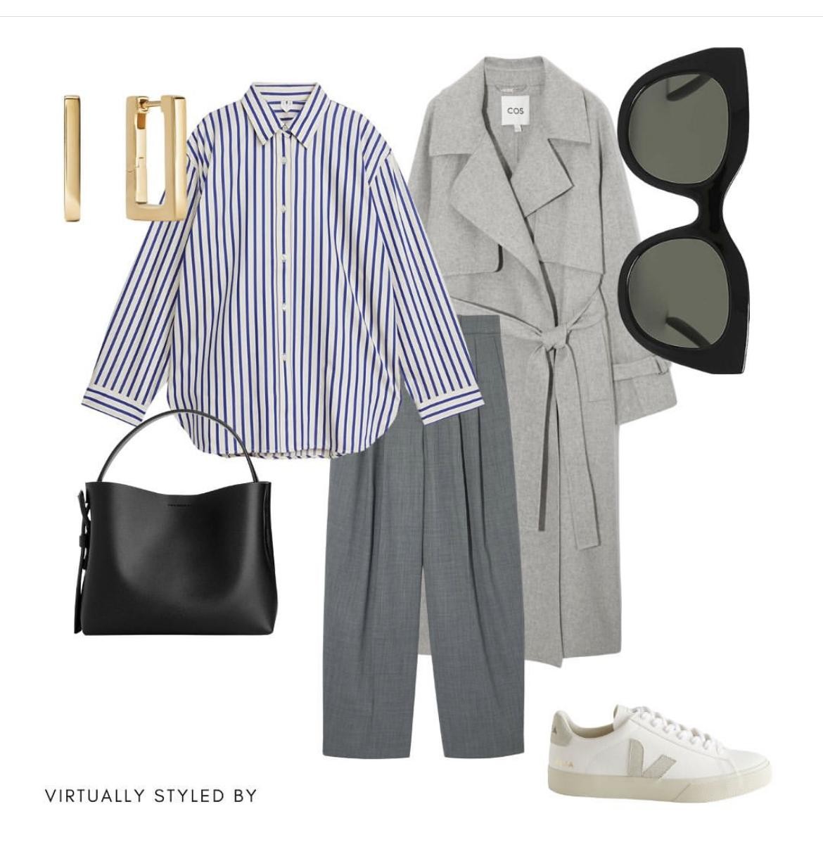当然,永远都可以偷个懒,黑白条纹衬衫配浅色牛仔裤会看起来很清爽,再加上浅烟灰大衣,即使都是深色系也会显得轻盈,彻底告别冬天的沉闷感。