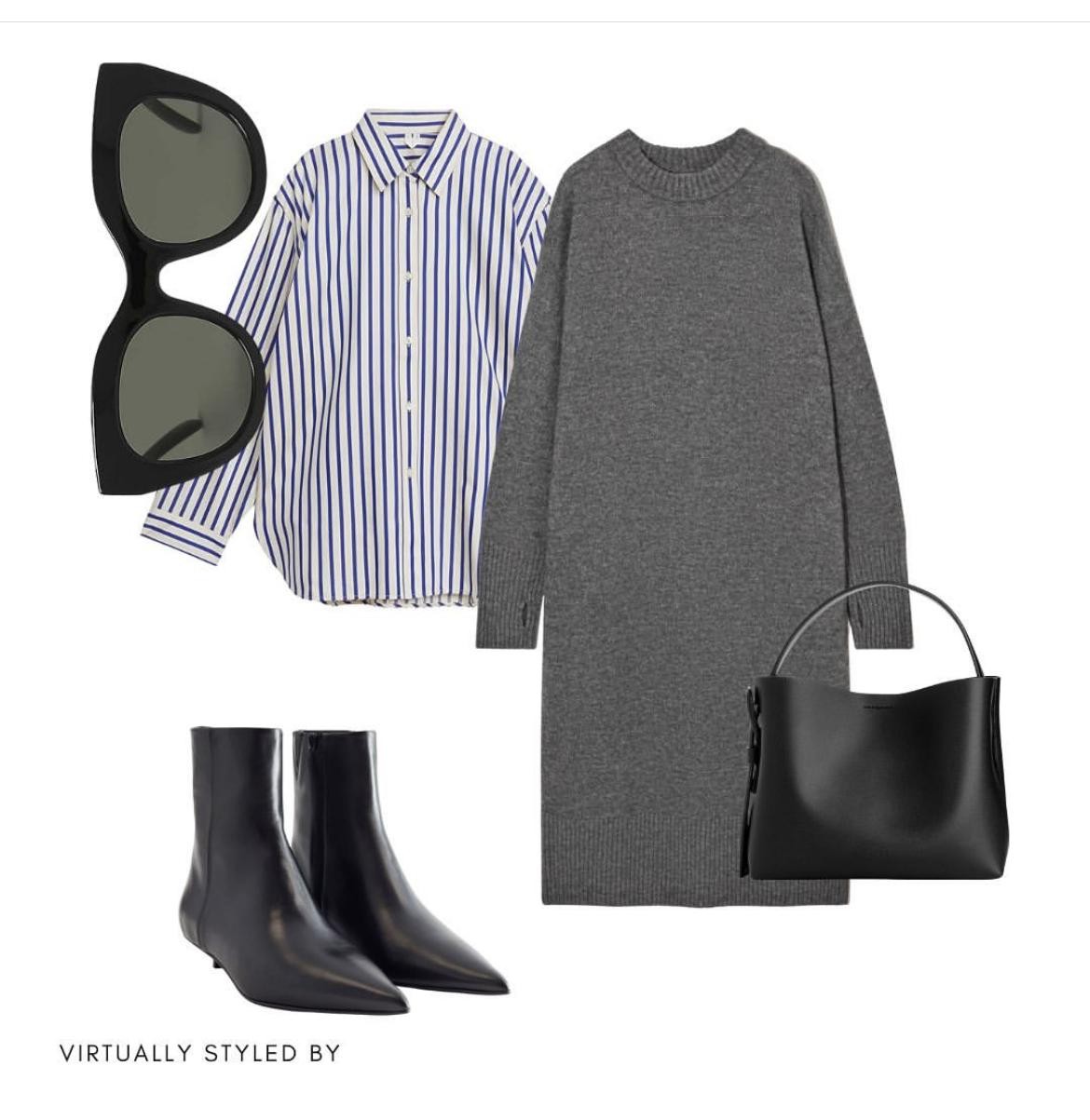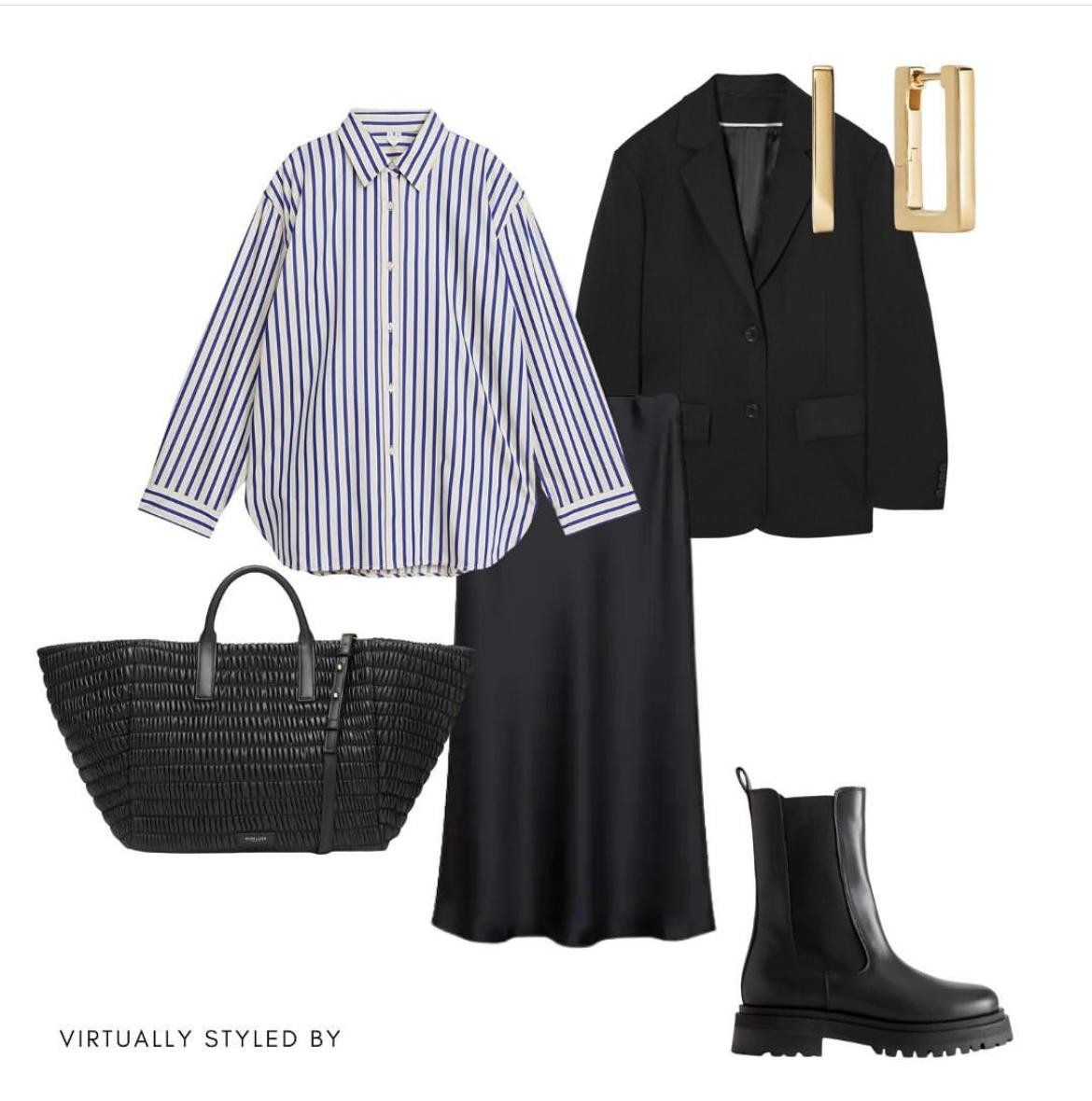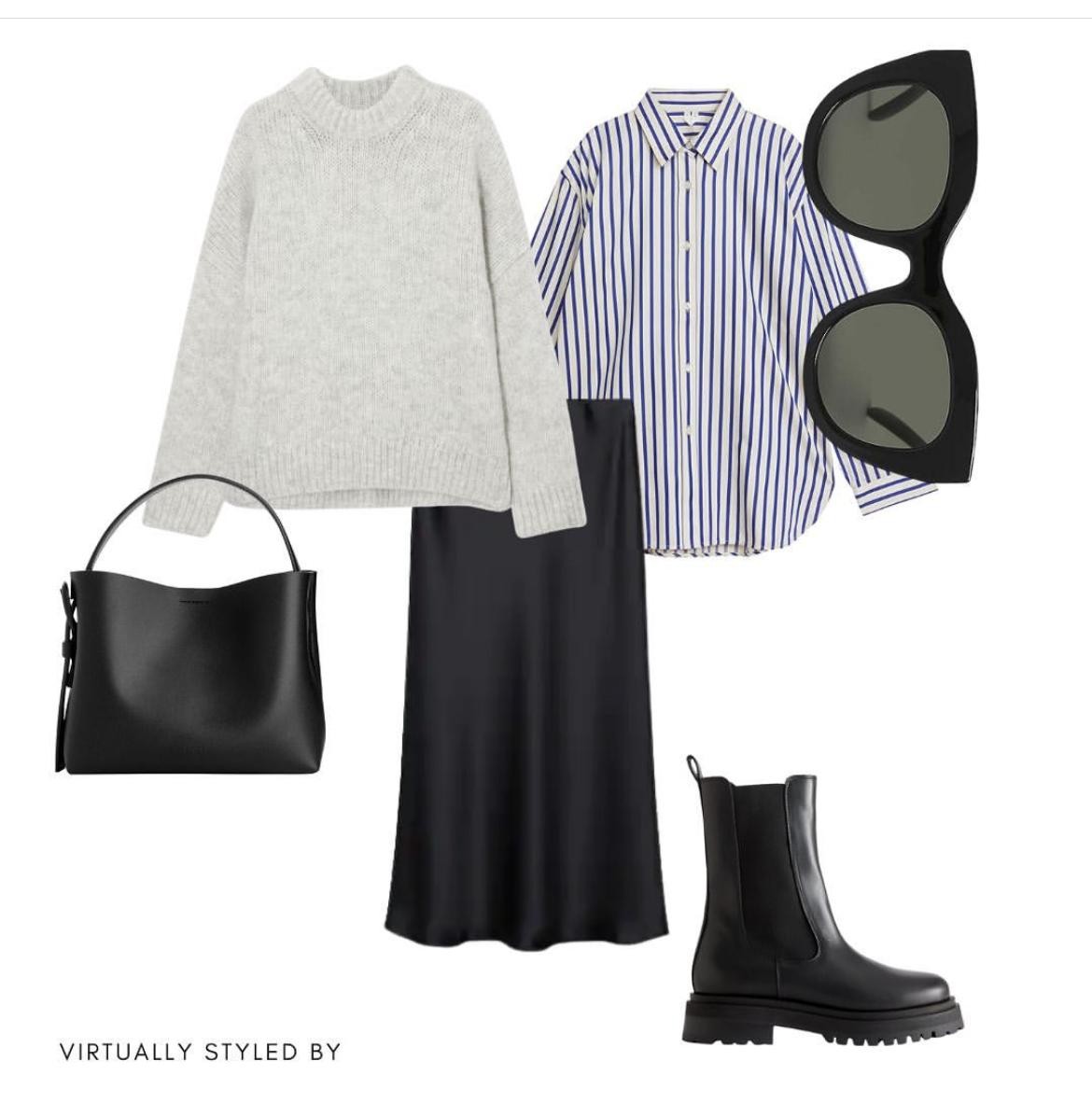 别忘了黑色绸缎裙,温柔的裙摆与宽松毛衣穿出慵懒闲适的感觉,用条纹衬衫穿出层次感,你会发现仅仅是加一件基础衣服,也能立刻提升穿衣质感,值得尝试哦。