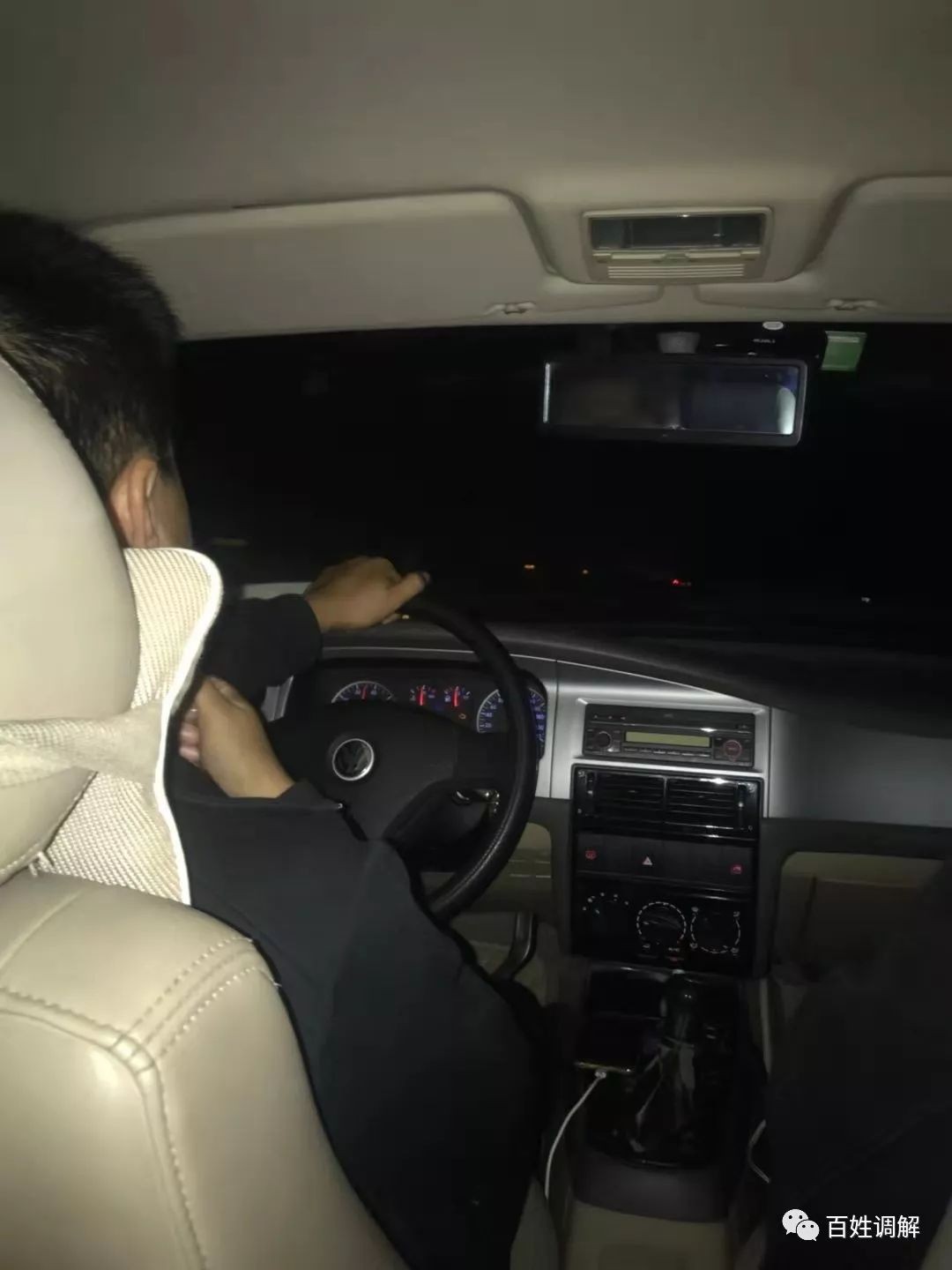 困意来袭,辛苦一天的调解员褚劲松靠在车里睡着了