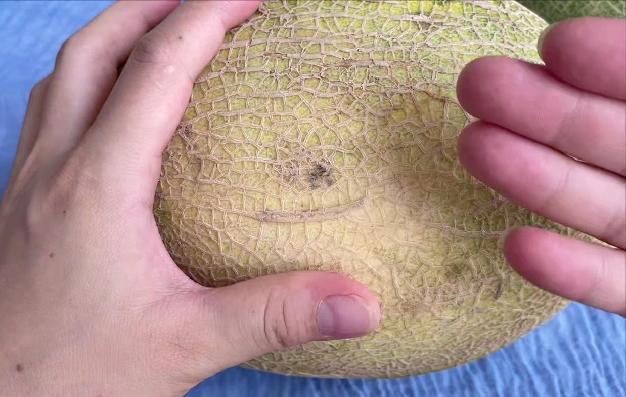 第三,我们可以掂一掂它的重量,如果说垫起来的重量非常的重,那有可能是没有成熟的瓜。如果太轻了,那这个瓜的储存的时间就比较长了。所以我们每一个瓜都进行掂量掂量,不管是看它的纹路还是它的果脐的一个位置,如果说它的重量是适中或者是稍微有一点重就可以进行选择了。这样的瓜的成熟度比较好,而且也香甜多汁。