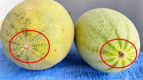第二,我们看一下哈密瓜底部的果脐,如果说果脐越小,证明瓜的成熟度越高,而且甜度会越高。因为果脐的一个位置是自然脱落的,我们可以看到它的果脐是比较大的,它外面的圈也是是比较大的。我们再看一下,右边的哈密瓜的果脐是比较小的,它的纹路圈圈也是比较小的,所以这个瓜它的一个成熟度比右边这个瓜的成熟度会高一些。右边这一个哈密瓜可能是还没有成熟就已经采下来了。所以朋友们在挑选哈密瓜的时候一定要看一下它底部的果脐,它的一个圈比较小,果脐比较小的,就建议大家进行购买,它的甜度有可能是非常高的。