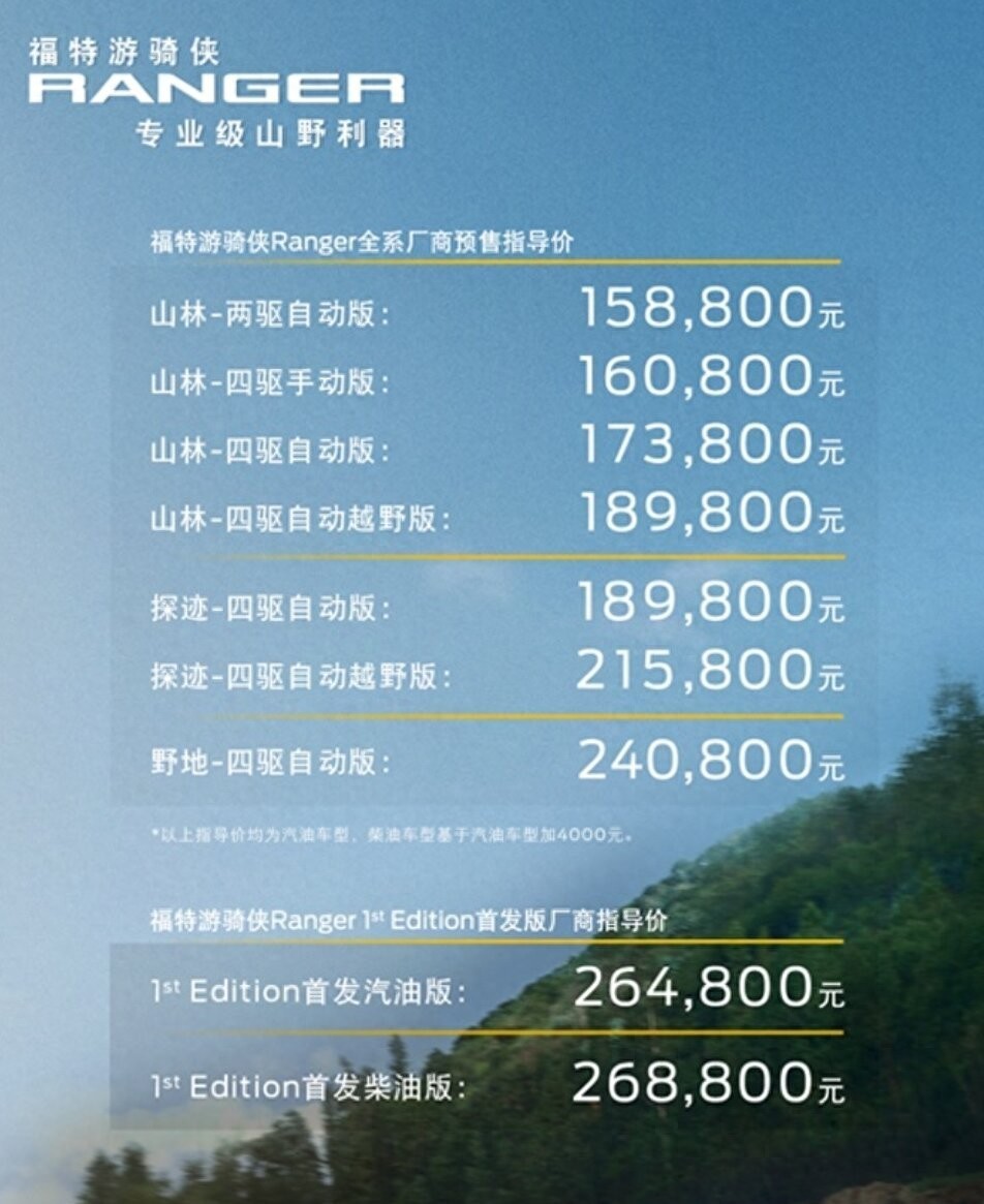 福特游骑侠Ranger预售价15.88万起,2.3T动力,配四驱系统