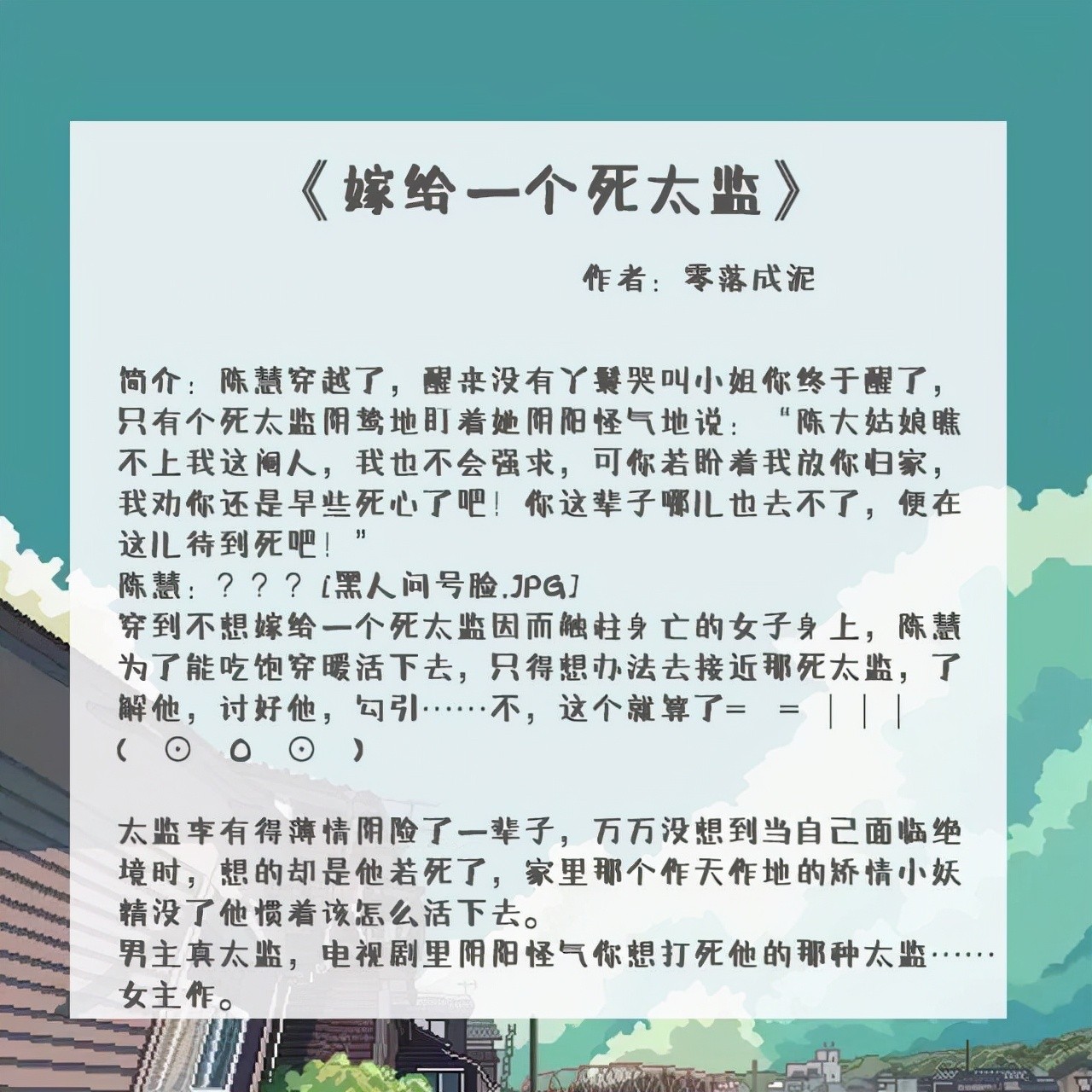 短书评:陈慧穿到了一个不想嫁给太监因而触柱身亡的女子身上,那太监阴险狡诈,说话做事阴阳怪气,跟普通电视剧里的太监一样是一脸的炮灰相。为了能吃饱穿暖活下去,陈慧只得想办法去接近那死太监,了解他,讨好他……谁能想到,她最后居然会喜欢上这样一个炮灰标配的真太监? 本文以诙谐幽默的方式,极为有趣又难以预料的情节展开,刻画了一个思维动作与众不同的机智可爱女主,以及从普通外表狡诈性格下也能挖掘出些许闪光点的男主,读来令人捧腹,根本停不下来。