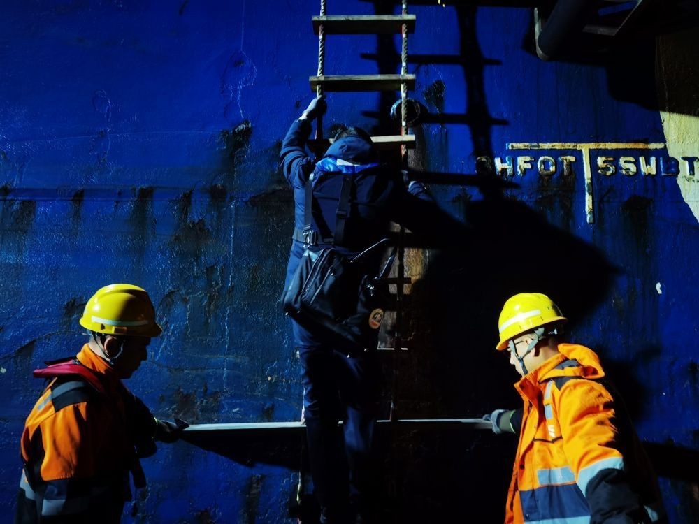 冬日的寒风里,引航员常常要乘坐引航船,在船与船上下跳动、左右摇摆中选择一个最佳时机,爬上十几米高的引航梯。