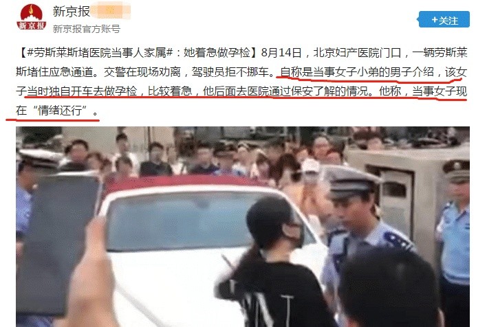 有位自称是“劳斯莱斯女司机”小弟的男子出现,说该女子当时是独自开车去北京妇产医院做孕检的,情况比较着急,他已经通过医院的保安了解了情况,目前当事人的“情绪”还可以。可根据院方给出了不一样的答案,院方称该女子只是去做普通妇科检查。而这位自称是“小弟”的男子是谁?其背后的大哥又是谁?