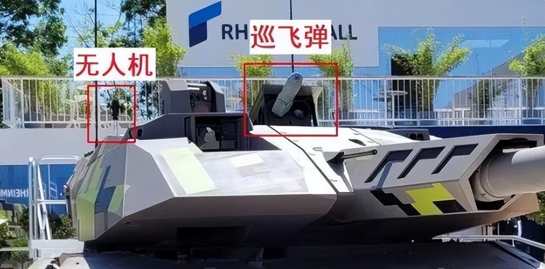 2、配置了4联装无人机(巡飞弹)。这是KF-51“黑豹”的一个亮点,在炮塔的后部,是一部4联装的“Hero120”自杀无人机(巡飞弹)系统,能看出来莱茵金属公司是非常重视无人机的使用的。