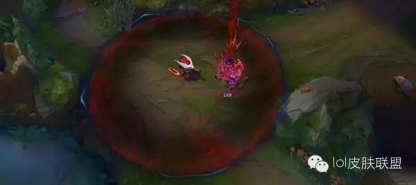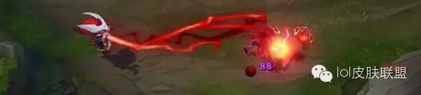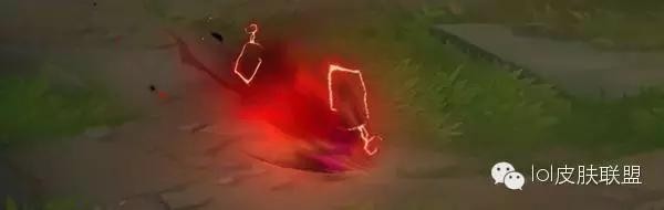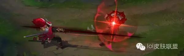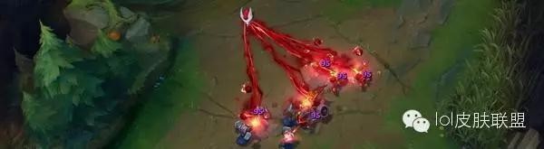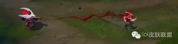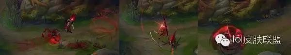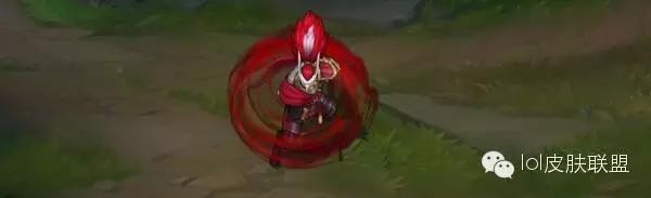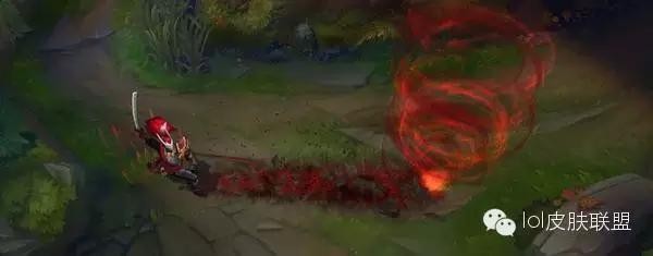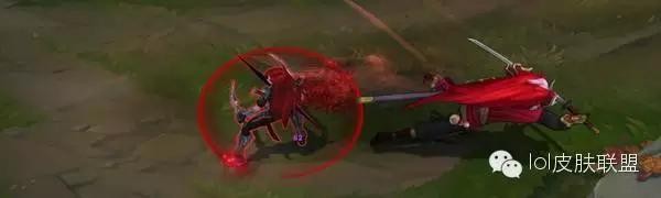 Q技能斩钢闪,击中目标后目标身上会出现血圈特效,腥红皮肤每次平A敌人都会在地上溅血。Q叠到三层时,身上的疾风也化为红色。Q刮出去的风化为血色龙卷风,从视觉上看比以前更大了。看地板的裂痕!