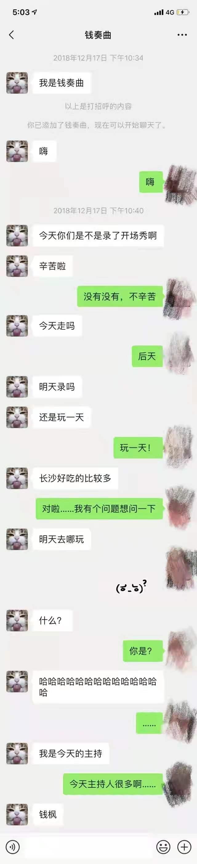 网友爆料,自己叫小艺,是一名90后的南方女孩,因工作原因于2018年参加湖南电视台《天天向上》节目的一期录制,录制过程中,并没有跟主持人接触,但在录制完结束之后,节目组工作人员发信息,说是主持人想要跟网友认识一下。