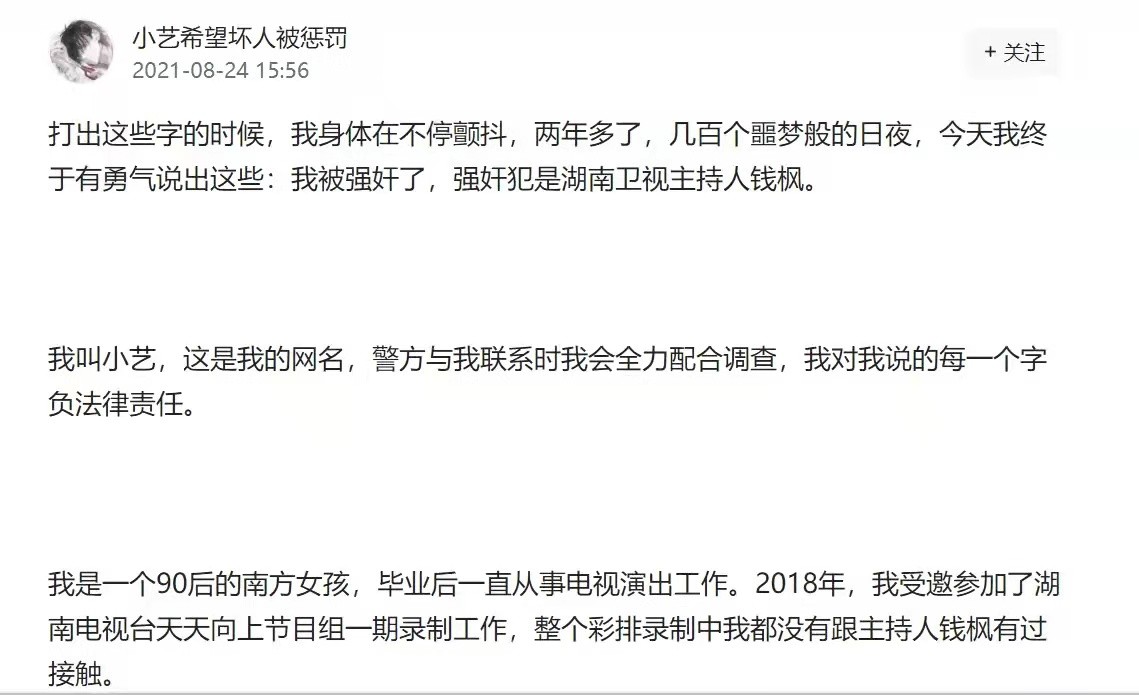 8月24日,湖南电视台知名节目主持人钱枫被网友“小艺希望坏人被惩罚”举报,说自己在2018年曾被《天天向上》主持人钱枫性侵,并附上了监控和聊天记录截图。