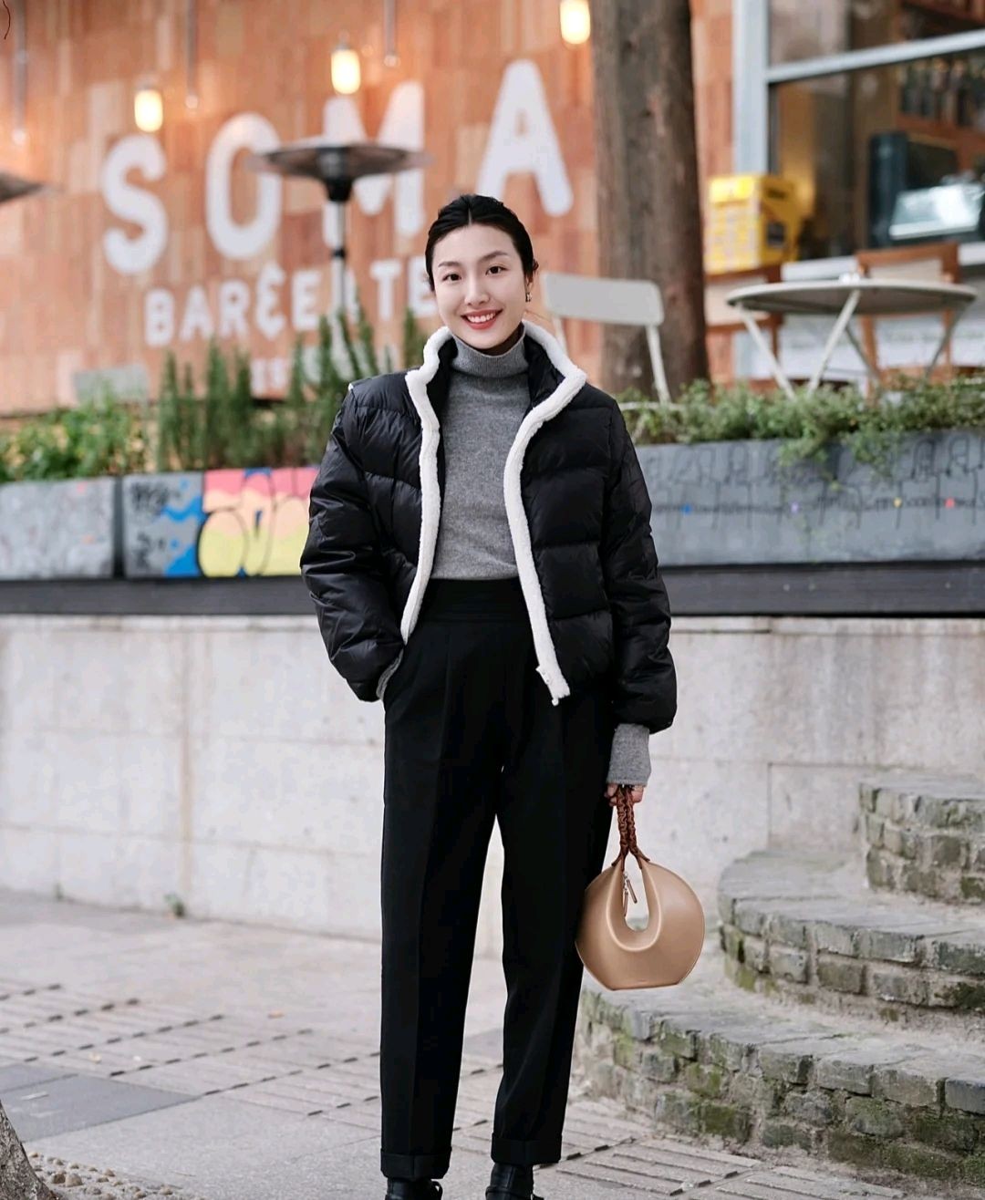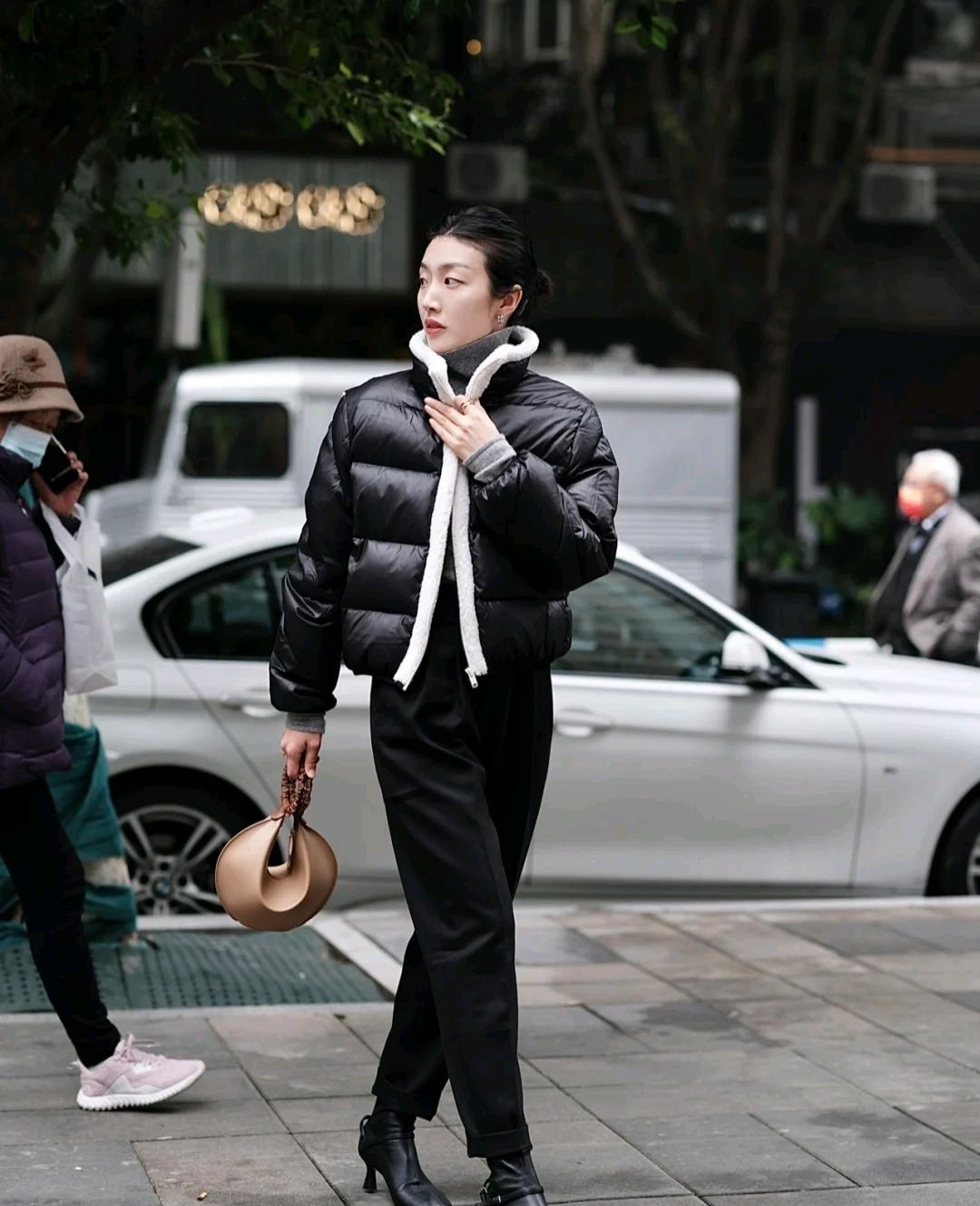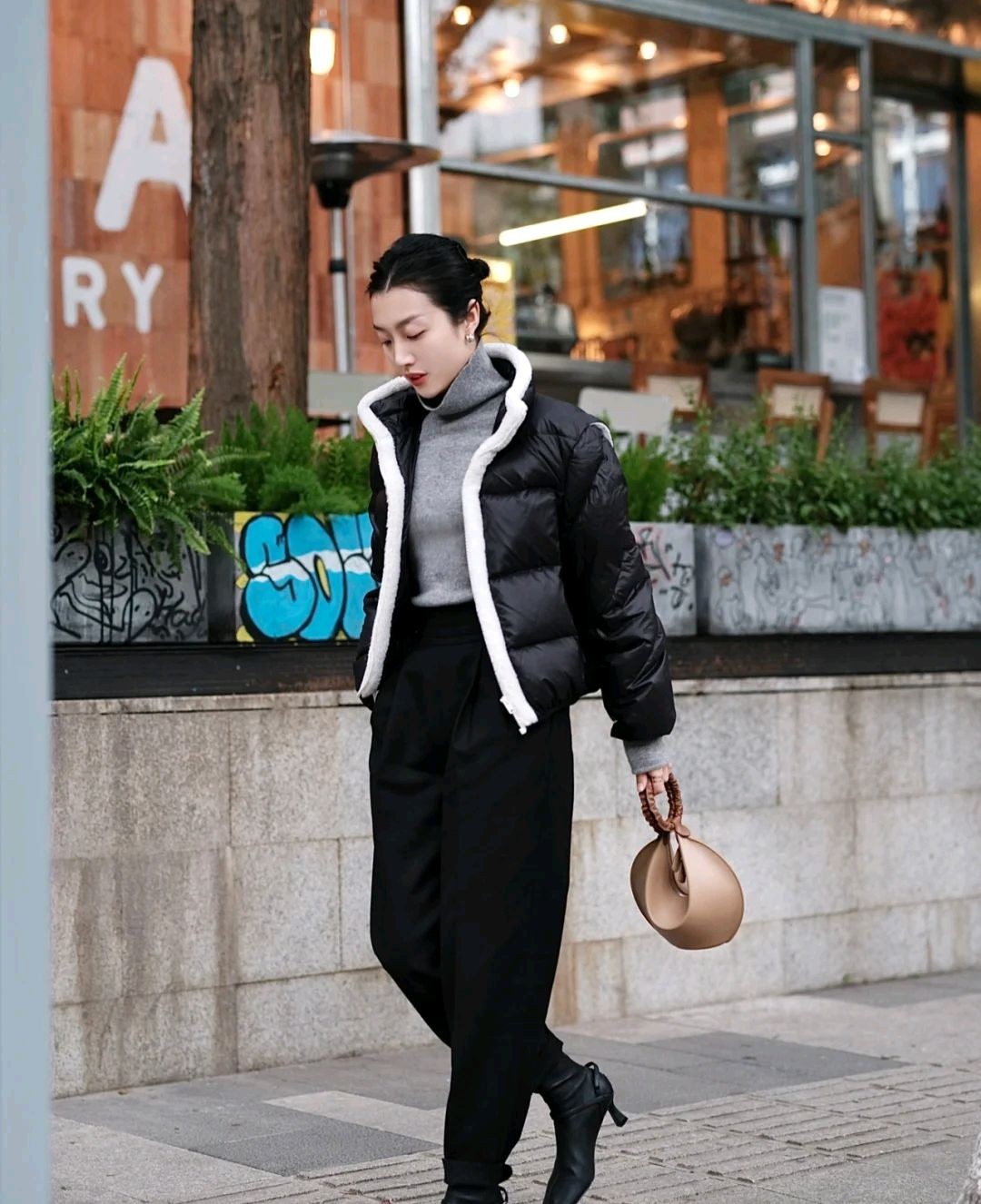 这位时尚博主不仅选对了羽绒服,而且很会搭配,她选择了黑色高腰裤来搭配,穿出来的视觉效果显高又显瘦,相信这是每个女生都想要的视觉感,所以这位时尚博主的穿搭细节值得细品。