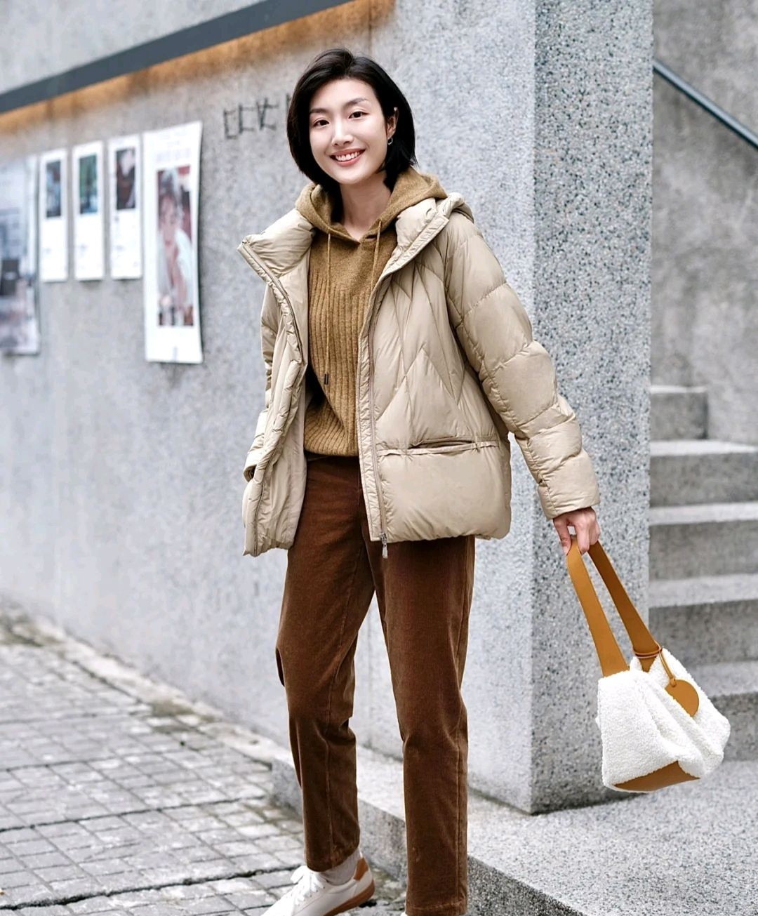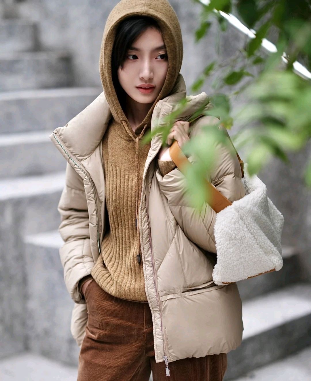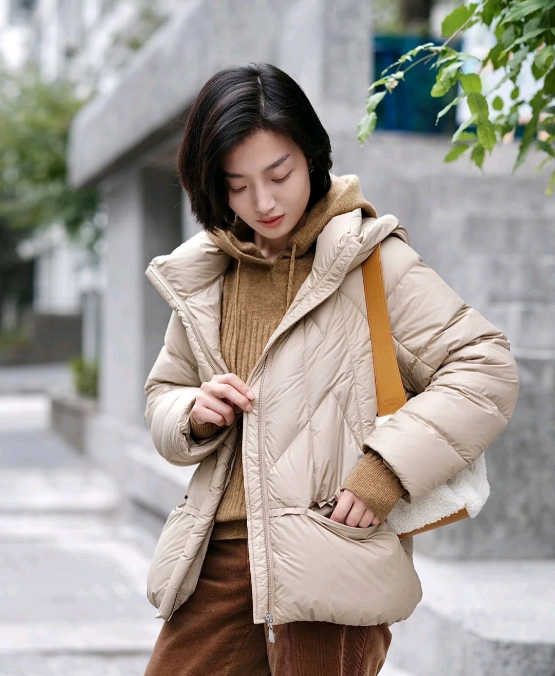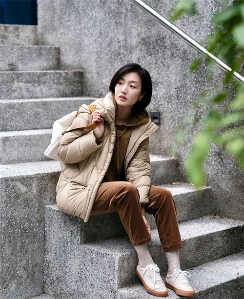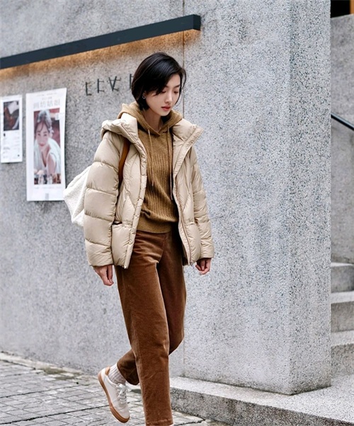 就好比这位时尚博主所穿的这套服装就很休闲,她选择了卡其色短款羽绒服搭配略显宽松的驼色裤子,虽然简简单单,却让人眼前一亮。