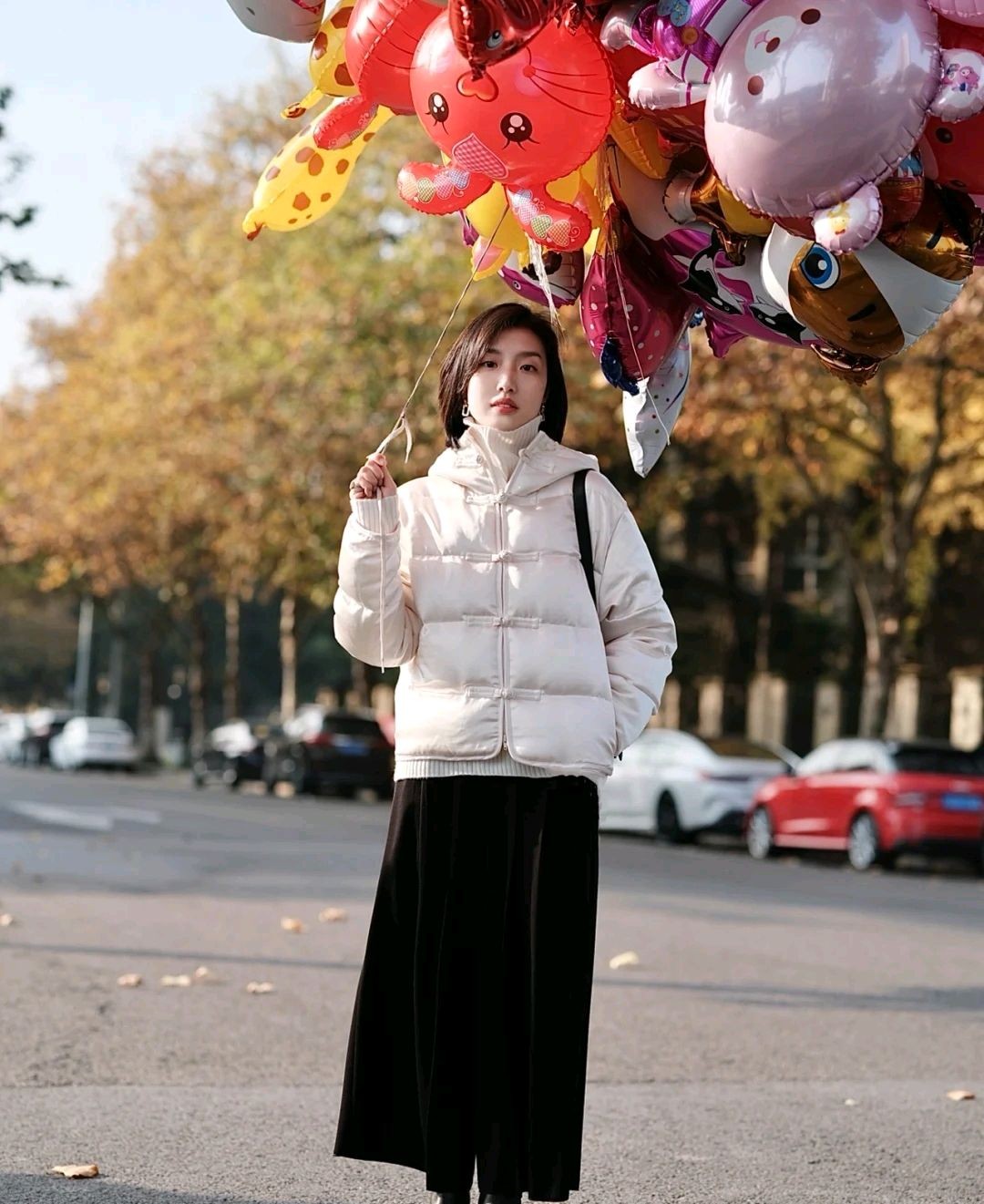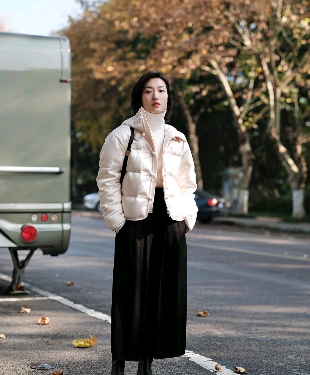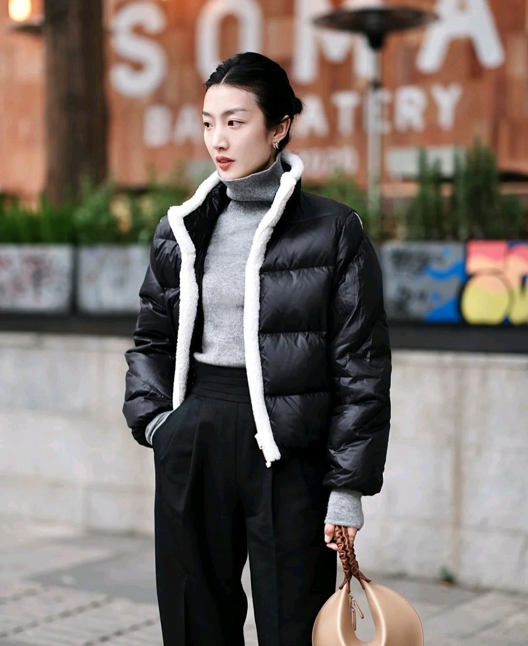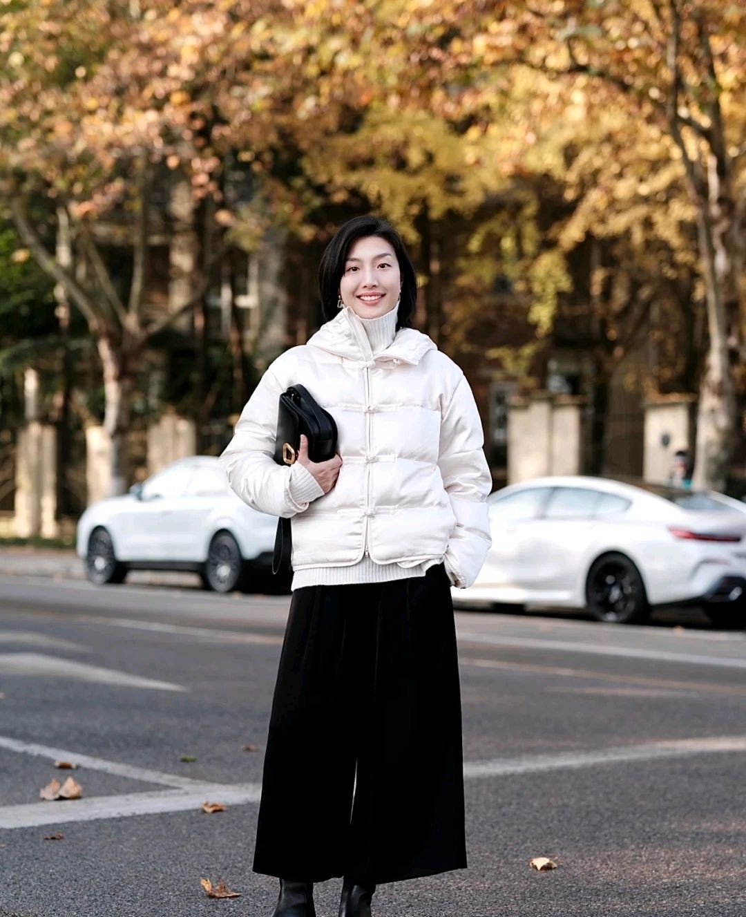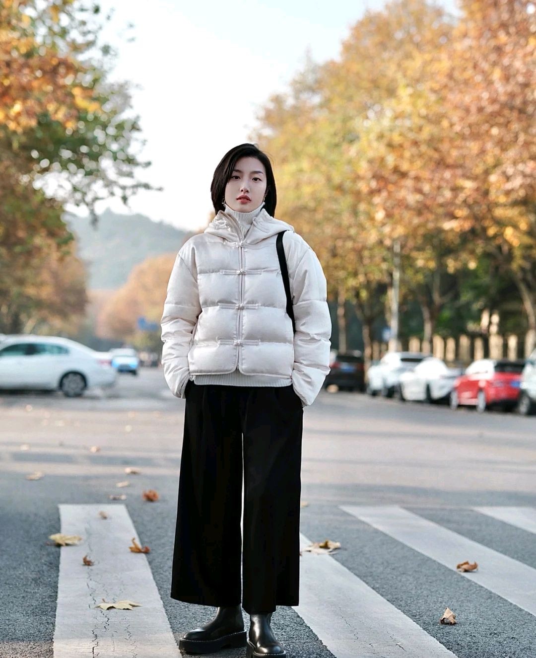 可以借鉴一下这位时尚博主的穿搭风格,她选择了米白色短款羽绒服搭配黑色高腰宽松裤,穿出来的视觉效果别有一番风味。