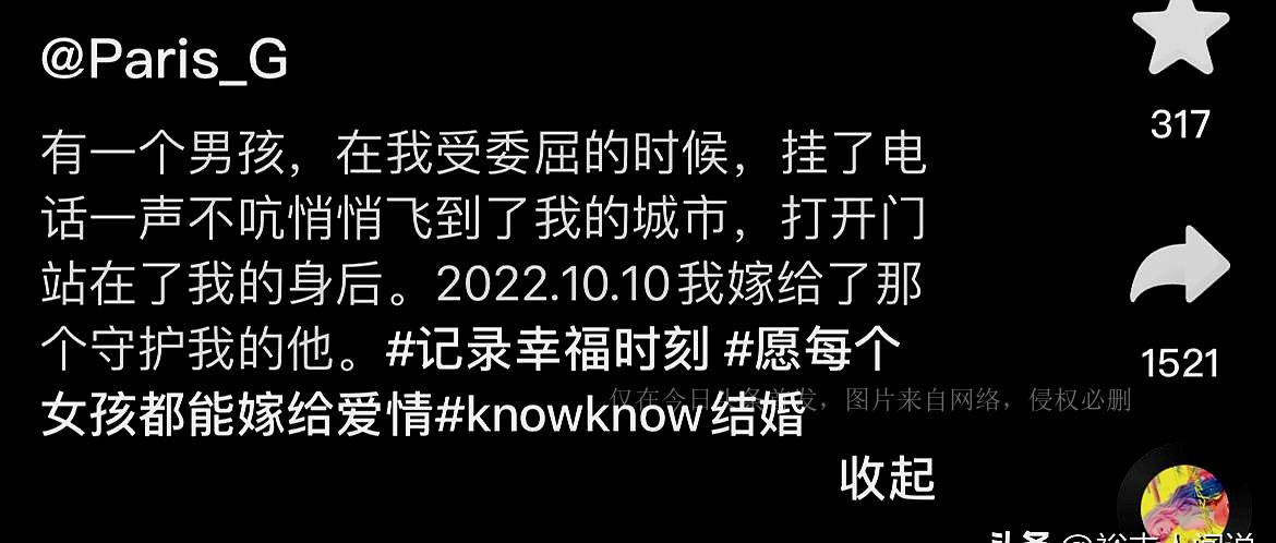 10月11号下午,知名网红,也是曾经的复旦校花龚叶轩官宣结婚喜讯,并在留言处表示有一个男孩,在我受委屈的时候,挂了电话一声不吭悄悄飞到了我的城市,打开门站在了我的背后。2022.10.10我嫁给了那个守护我的他。