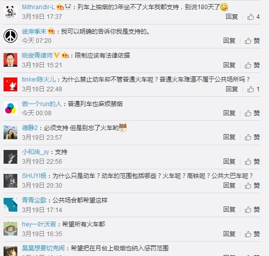 网友们除了声援此次动车禁烟意外,还呼吁在普通特快列车上乃至大街上也实施全面禁烟,彻底杜绝公众场合吸烟的危害。