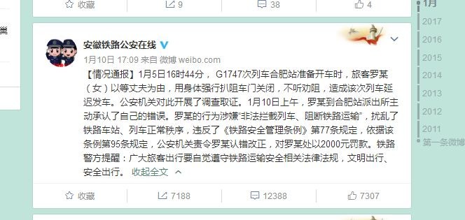 今年1月份,一女子以等丈夫为由,用身体强行阻挡动车车门关闭,在工作人员与乘警的再三劝阻下,该女子并不为然依旧强行阻挡车门,导致列车长时间无法发车,最终对工作人员和乘客都造成了比较大的影响。最终经过警方的取证调查,对于该女子进行了相关处罚。
