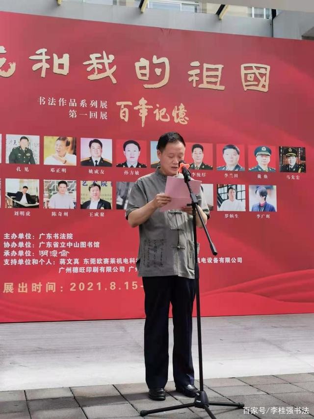 出席展览开幕式的领导有原广州军区政治部副主任邓正明将军,广州军区联勤部副部长孙方敏将军,广东书法院李远东院长,广东省立中山图书馆领导和社会各界知名人士等。此次书展借用“我和我的祖国”这首歌的歌名作为书法作品系列展展名,开展书法作品系列展活动,用书法艺术歌颂我们伟大的祖国、激发爱国热情。第一回展以“百年记忆”为展名,讴歌中国共产党的百年光辉历程。