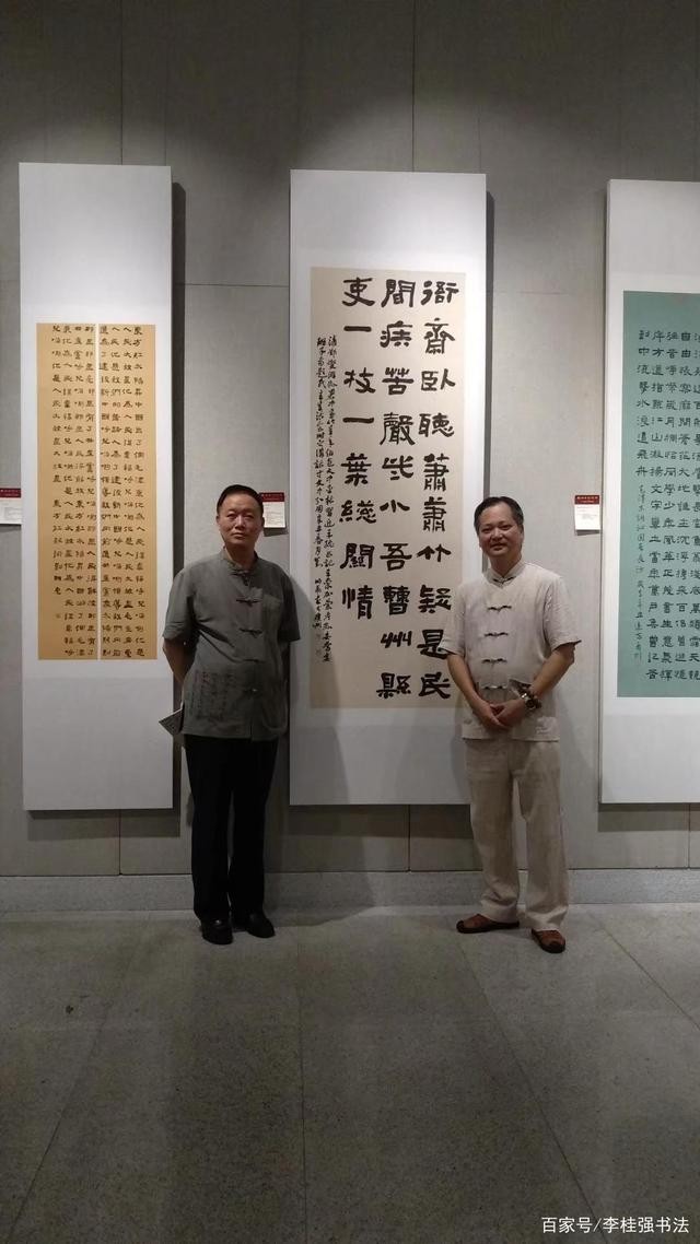 军旅书法家李桂强先生(右)与陈政书法传人陈聪先生在欧阳金谷中将作品前留影