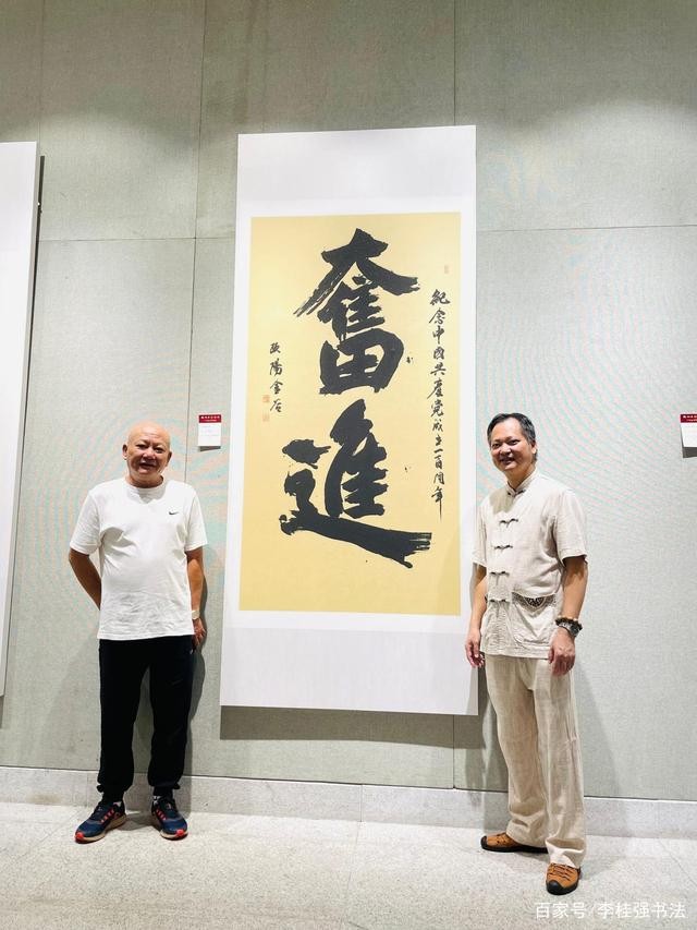 李桂强(右)与老战友喻英华先生在参展作品前留影
