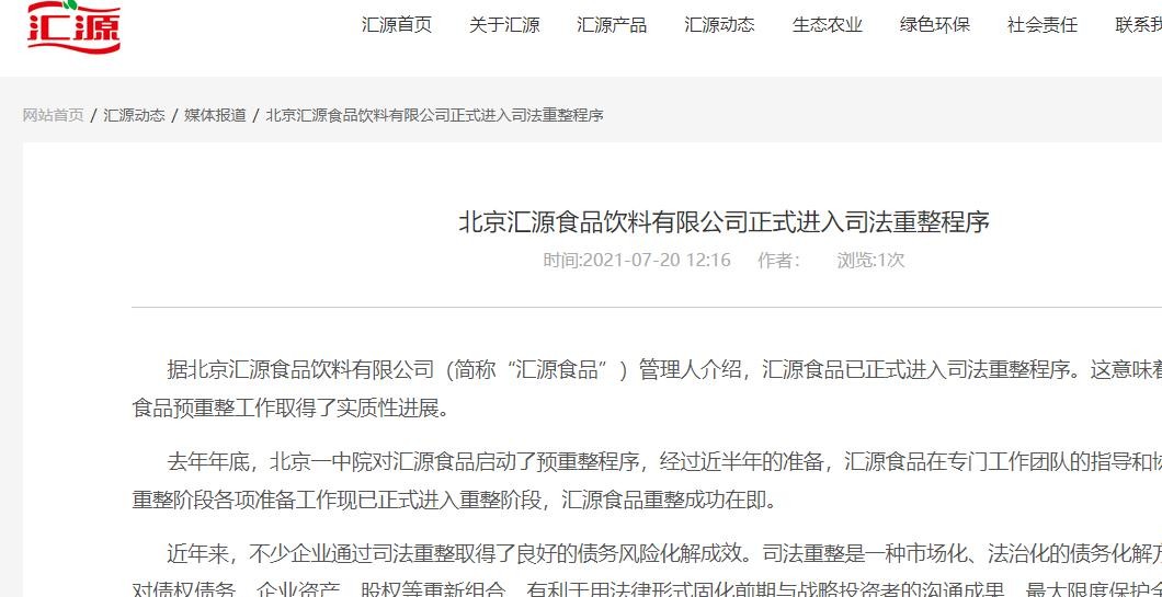 2022年,汇源重整方案获得通过,并由北京市第一中级人民法院裁定批准,上海文盛资产管理股份有限公司作为重整投资人计划投入16亿资金,成为汇源的控股股东。
