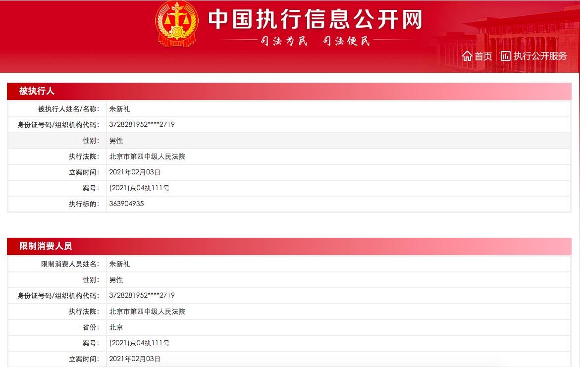 2022年,朱新礼因为个人负债高达几十亿,被列为失信人。