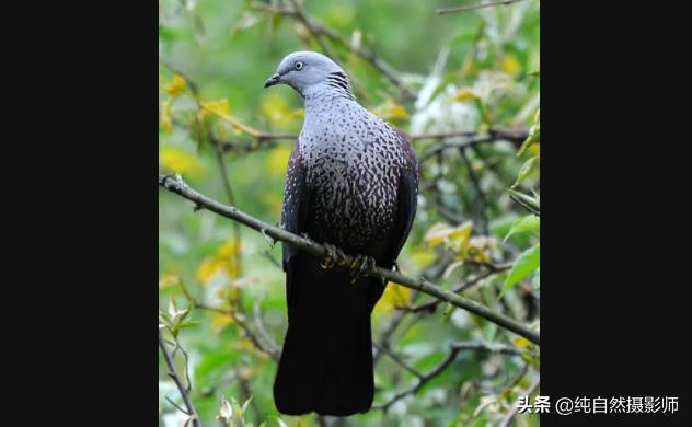 体型中等(38厘米)的褐灰色鸽。翼覆羽多具白点。与其他所有鸽种的区别在颈部羽毛形长而具 端环,体羽无金属光泽。头灰,上背紫酱色,下背灰色。虹膜-灰白;嘴-黑,嘴基紫色;脚-黄绿色,爪艳黄色。