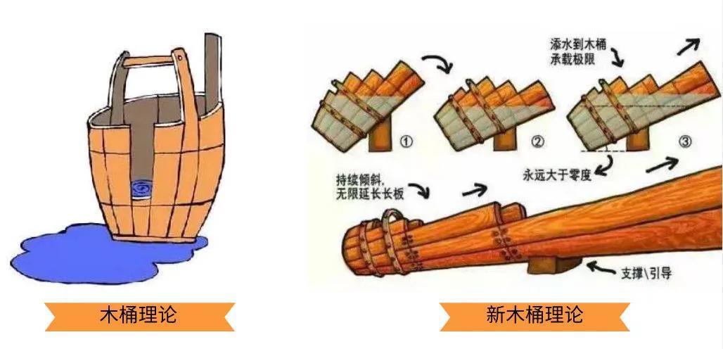 「新木桶理论」登上舞台:木桶正放时,盛水的多少决定于短板。而只要稍稍转变思路,把木桶斜过来放置。