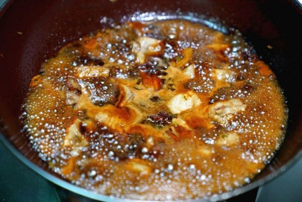 6.糖醋汁翻炒均匀后,再加入适量的开水没过排骨。盖上盖子用大火烧开。水烧开后用中火炖20分钟。20分钟后,用大火收至汤汁浓稠。