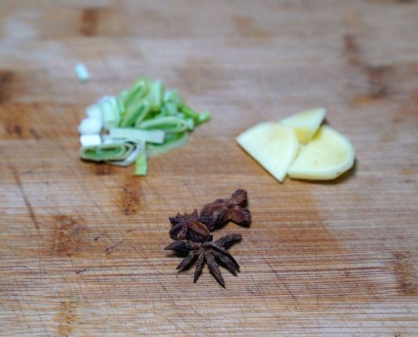 4.准备配料:大葱半根切成葱花,老姜一块将其切片备用。八角两颗放入碗中。准备好糖醋汁。接下来开始上火制作。