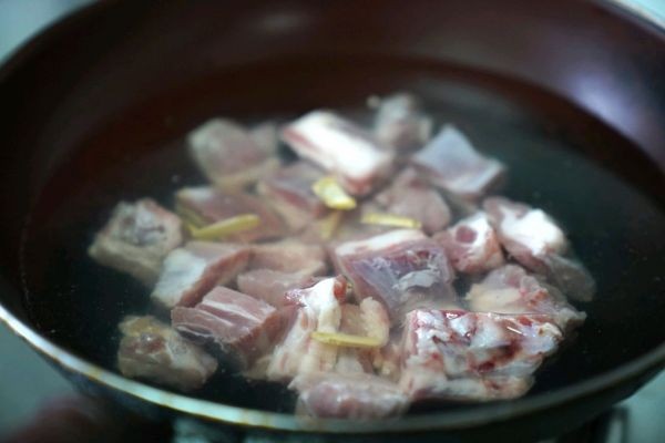 2.炒锅中加入适量的冷水,冲洗好的排骨放进去。然后再放入几个姜片、大葱片不用盖盖子大火烧开。这一步是给排骨焯水。水开后撇去表面的浮沫,然后开中火继续煮三分钟立即捞出。