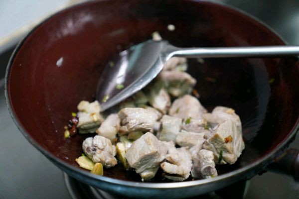 5.炒锅烧热,将沥干水分的排骨放在里面用中火翻炒一下。翻炒至表面焦黄,把里面多余的水分炒出来。然后放入配料炒香。配料炒香后,直接倒入提前准备好的糖醋汁。大火翻炒均匀。