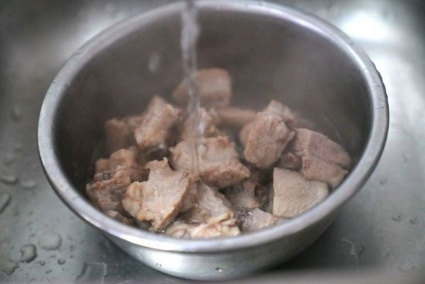 3.排骨捞出后放入温水中清洗掉表面的浮沫,这样浮沫容易清洗哦。而且里面的浮沫不容易回缩。