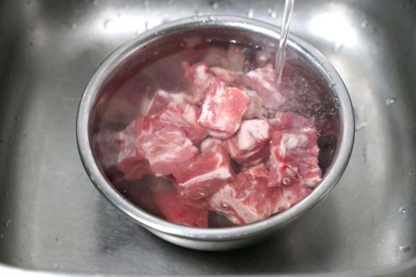 1.首先准备新鲜的排骨两斤,放在案板上给它剁成小块。然后放在清水中给它冲洗一下冲洗掉表面的血水。这里的排骨大家最好选择肋排哦。比较大一点的骨头建议大家做酱大骨吃。