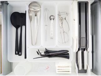 你家的筷子、刀叉、勺子是不是经常混合在一起,用起来特别不方便。在抽屉里放置几个尺寸不一的储物盒就能轻松解决。