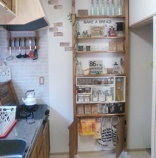 厨房里瓶瓶罐罐太多,台面储物空间小,在厨房打造一个简单的储物架,各种瓶瓶罐罐都归纳于此,节省很多吊柜和台面的空间。