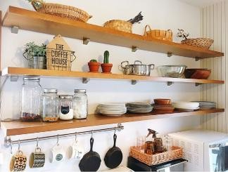 充分利用吊柜和料理台之间的空隙安装搁板架,常用的碗碟和调料都能放在这里。