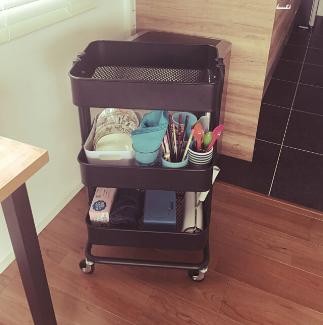 碗碟和筷子放在小餐车里,用几个简易的储物盒分类即可,小餐车放在厨房角落,不占空间。