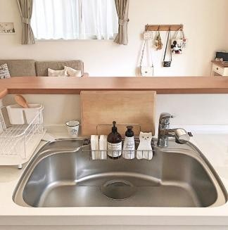 在水槽旁边放一个小支架,菜板就可以收纳于此,既不占空间又方便取用。