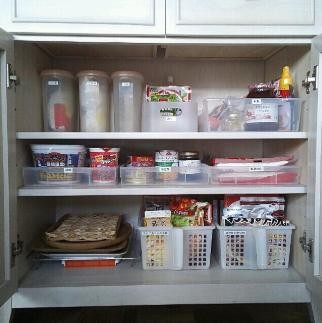 吊柜储存空间很难使用,放在里面的东西经常堆叠在一起,可以用储物篮划分吊柜使用空间,同类物品装在一个篮子里打上标签,再也不会打开吊柜一片混乱了。