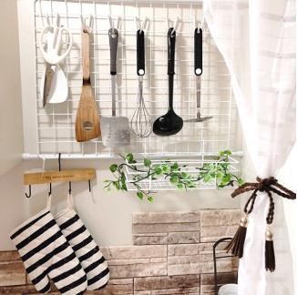 墙壁上挂一个铁丝网,再搭配几个挂钩,就能解决饭铲、菜铲的收纳问题,打蛋器、厨房用剪刀都能挂在铁丝网。