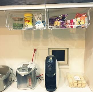 小房子一点空间都不能浪费,厨房吊柜下安装几个半封闭储物篮,盐和调料放在这里,非常实用。