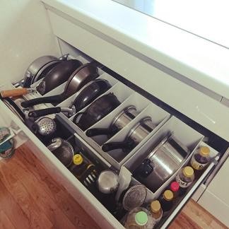 各种炒锅、煎锅特别占空间,常常需要2、3个橱柜才能够储存,现在一个抽屉就够了。用文件盒能够实现一个抽屉收纳家里所有炒锅,再也不用翻箱倒柜找锅了。