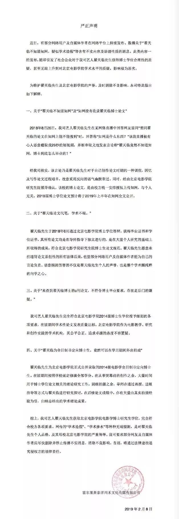 而翟天临工作室在2月8日发布声明,称不存在抄袭等学术不端行为,并称翟的博士论文将于2019年上半年全文公开。