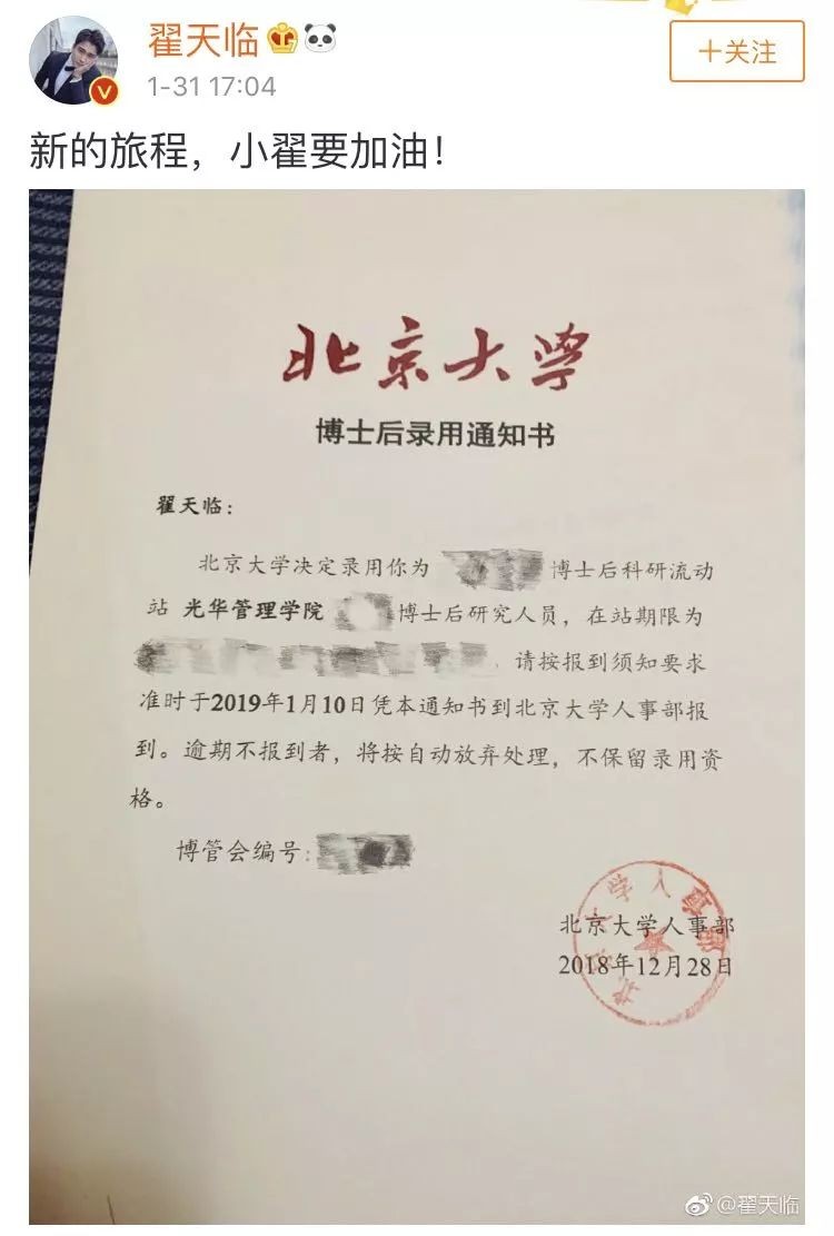 今年1月31日,翟天临在微博晒出了北京大学的录用通知书,证实自己将去北大任博士后。