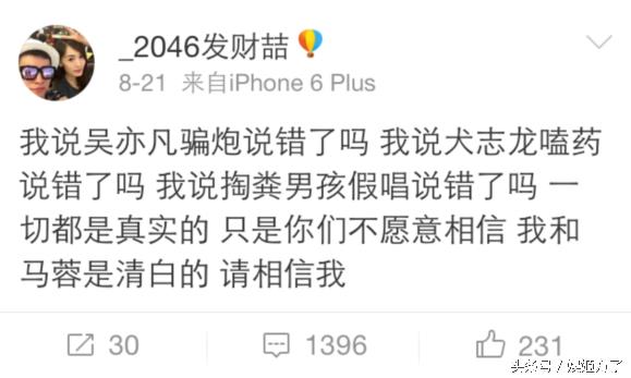 微博中宋喆不仅提到自己离婚不出庭是沉迷了游戏,在他之前发表的微博中,还炮轰权志龙嗑药、吴亦凡骗炮、TFboy假唱。还恬不知耻地说他和马蓉是清白的,真不知道宋喆脑子是怎么想的。不过这也不排除是黑心网友故意做的,但要是真的是宋喆自己的微博那就该狠狠地声讨他。