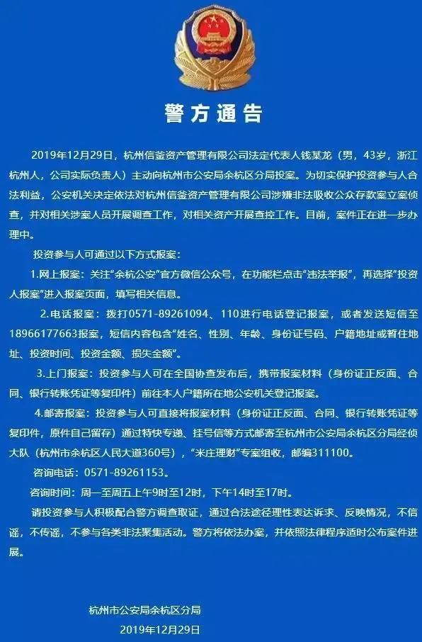 公安机关依法对杭州信釜资产管理有限公司涉嫌非法吸收公众存款案立案侦查。